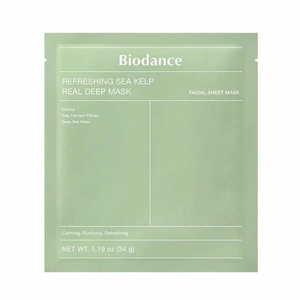 The Biodance Refreshing Sea Kelp Real Deep Mask is a nutrient-rich sheet mask infused with sea kelp extract to detoxify, hydrate, and refresh the skin.