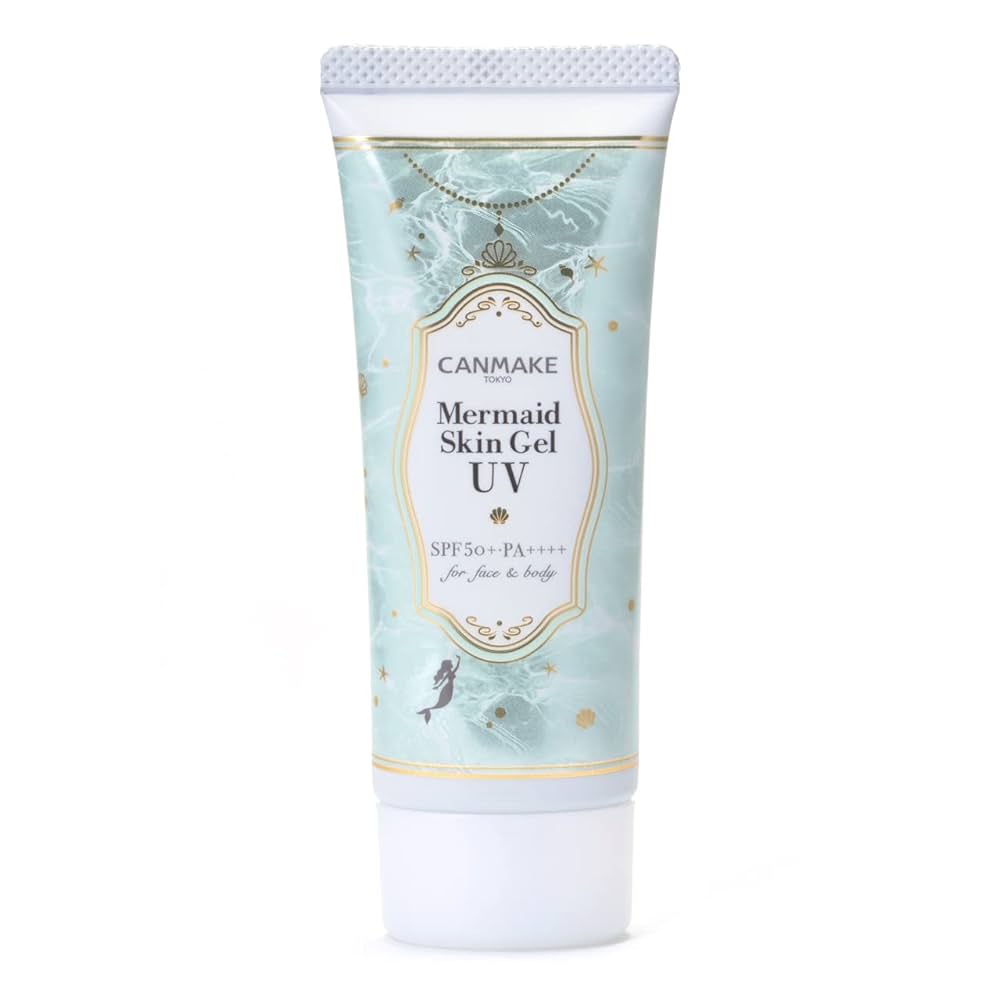 • The Canmake Mermaid Skin Gel UV Sunscreen SPF 50+ PA++++ provides lightweight, watery sun protection that feels like a hydrating gel rather than a heavy sunscreen. It absorbs quickly without leaving a white cast, making it perfect as a makeup base or for daily wear.