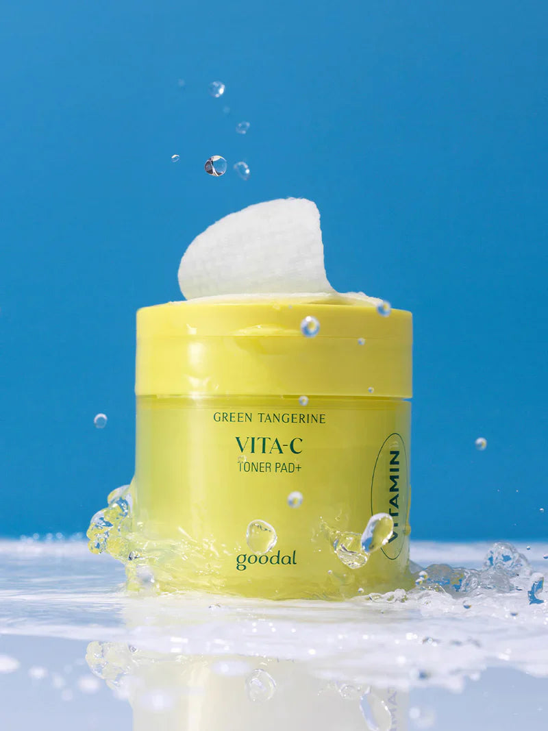 Goodal Green Tangerine Vita-C Dark Spot Care Pad Toner Pad+ are pre-soaked pads designed to tone, exfoliate, and brighten the skin.