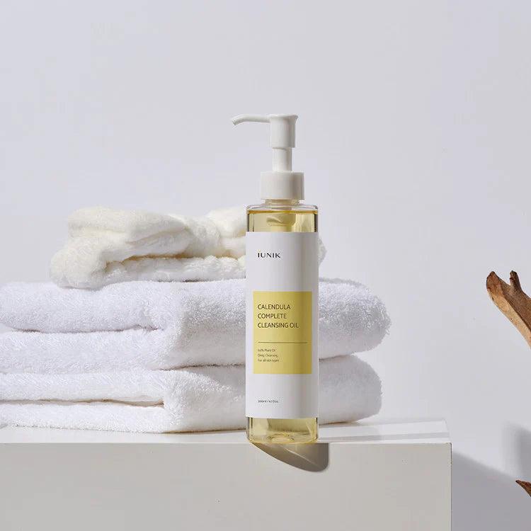 iUNIK Calendula Complete Cleansing Oil, a deep cleansing oil infused with 94-percent plant oils, as well as calendula flower extract to remove all traces of makeup and impurities, while leaving the skin feeling soothed and moisturized.