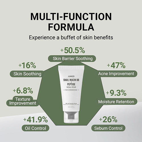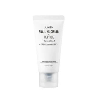 JUMISO Snail Mucin 88 + Peptide Facial Cream is a nourishing facial cream formulated with 88% snail secretion filtrate with anti-inflammatory properties to repair damaged skin, while boosting skin moisture level, keeping skin plump.