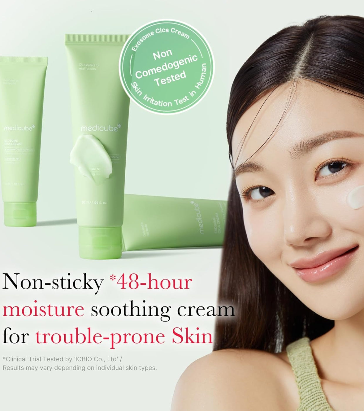 The MEDICUBE Exosome Cica Cream delivers intensive soothing and long-lasting hydration with its advanced formula featuring 12 types of Cica ingredients, Ceramide NP, and Ectoin. This dermatologist-tested cream helps calm irritation, strengthen the skin barrier, and lock in moisture for up to 48 hours.