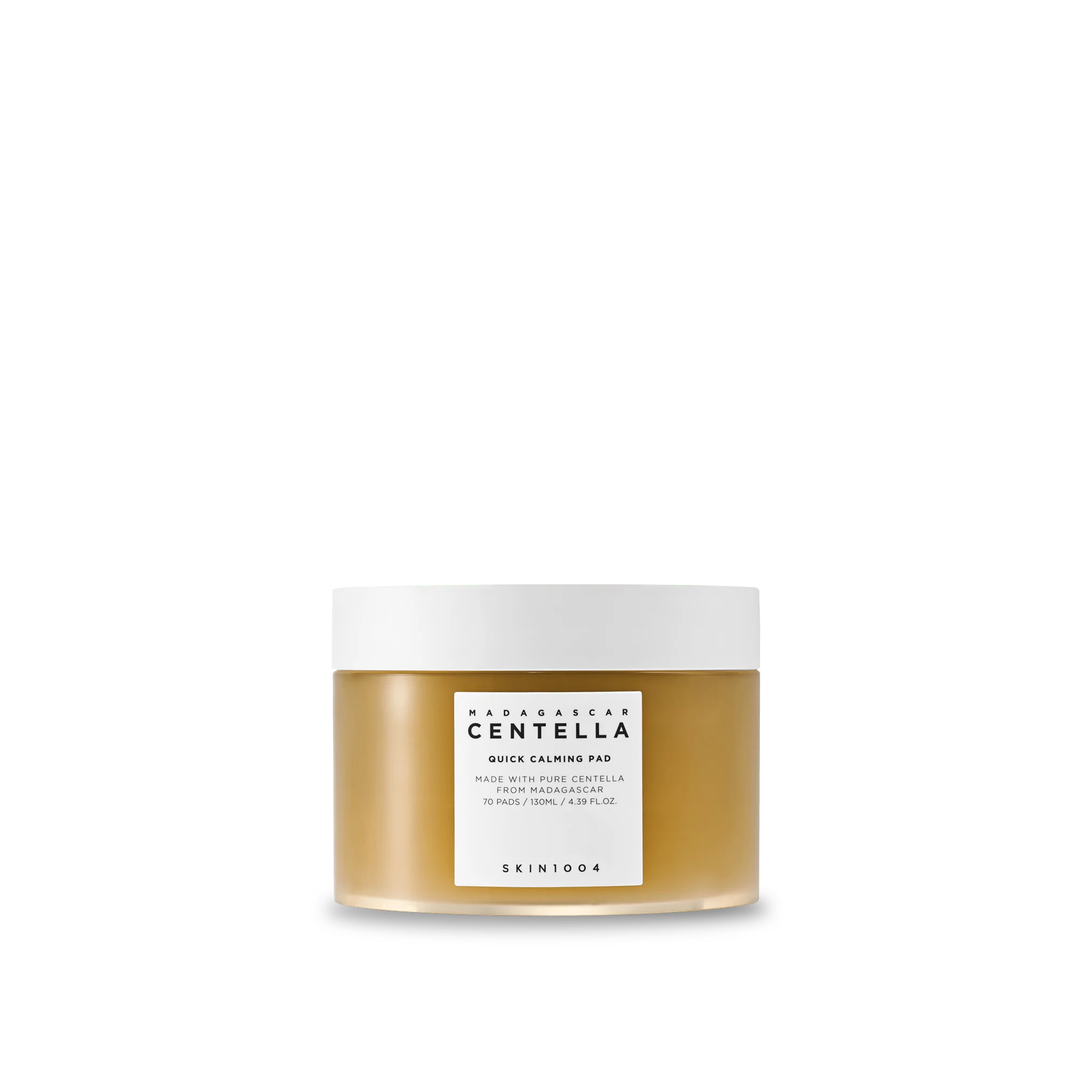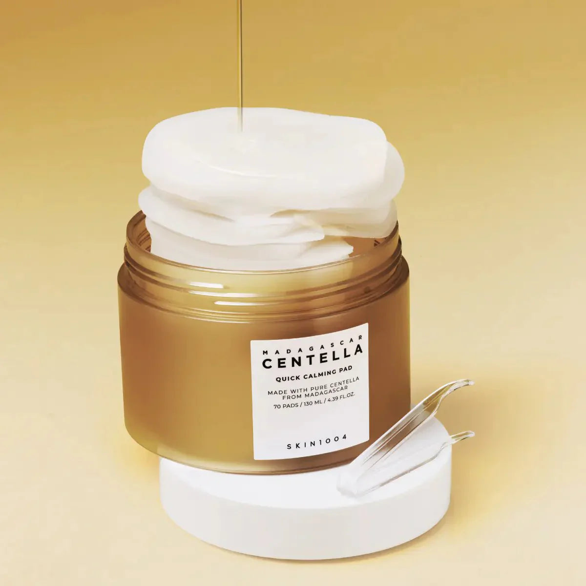 The Skin1004 Madagascar Centella Quick Calming Pad (70 pads / 130ml) is an essence-rich toner pad formulated to soothe irritated or sensitive skin in a simple 2-minute step. The pads are soaked with a formula featuring 49% Centella Asiatica Extract, Panthenol, and Sodium Hyaluronate to calm, hydrate, and support skin barrier health. They are alcohol-free, fragrance-free, and made with only 10 EWG Green Grade ingredients. The large, triple-layer, crescent-moon shaped pads adhere well, allowing coverage around the eyes and nose without slipping.